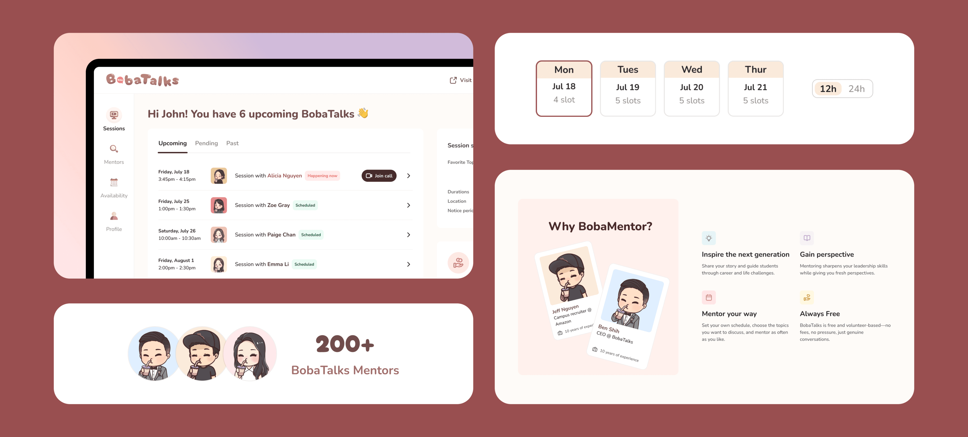 The goal was to preserve the brand’s expressive character without compromising usability, ensuring every component not only looked like BobaTalks but also worked seamlessly for mentors and mentees alike.