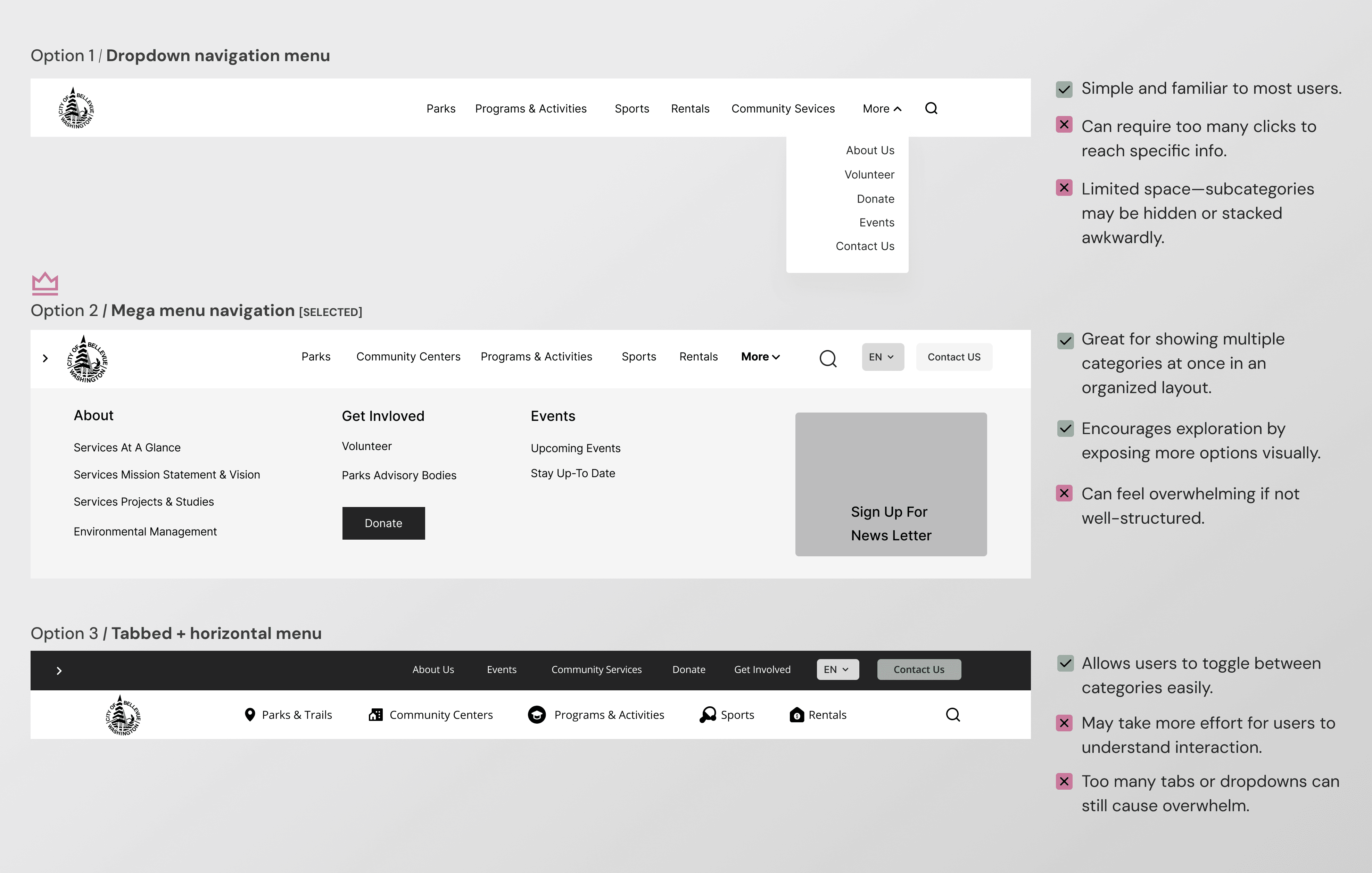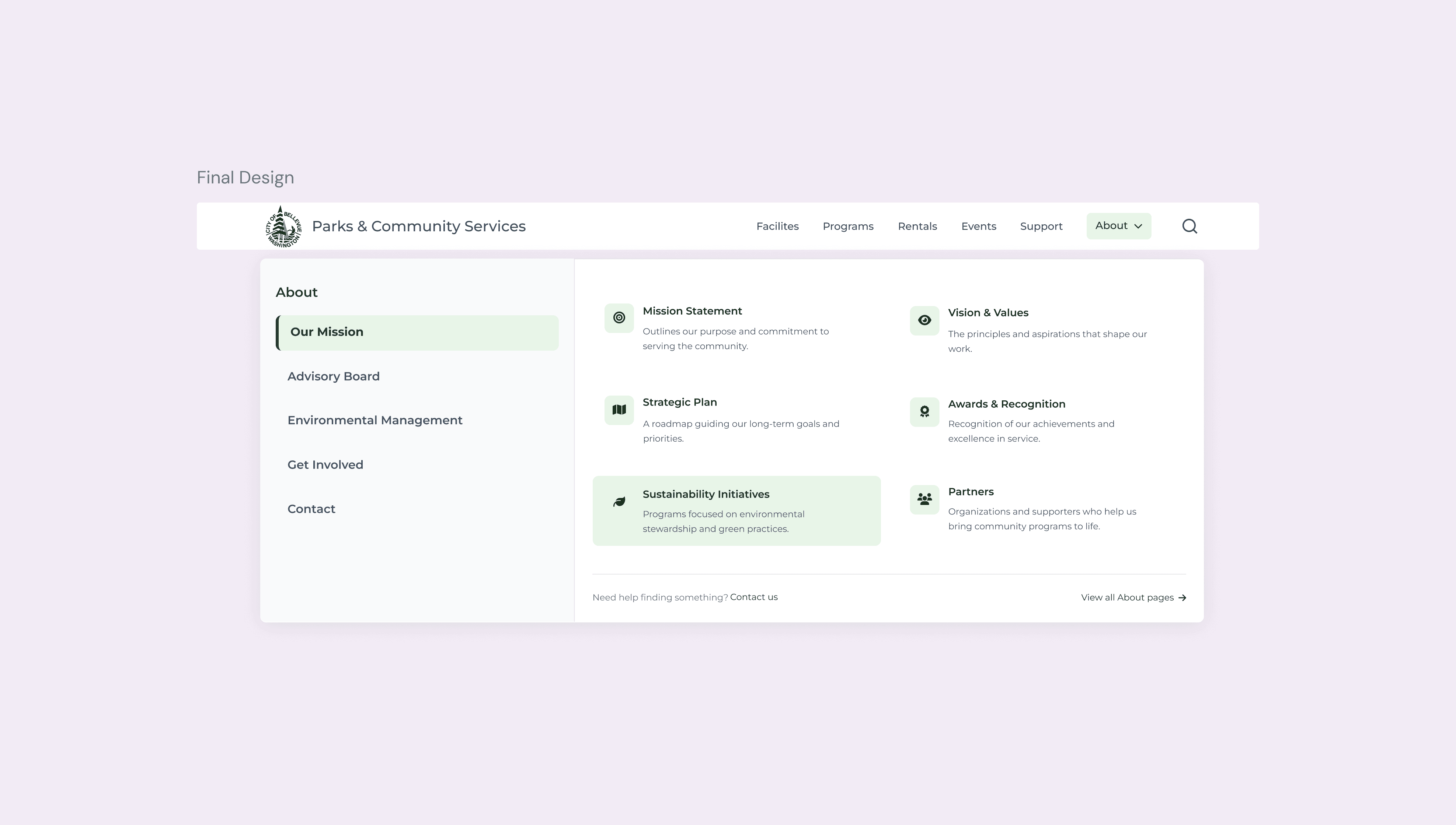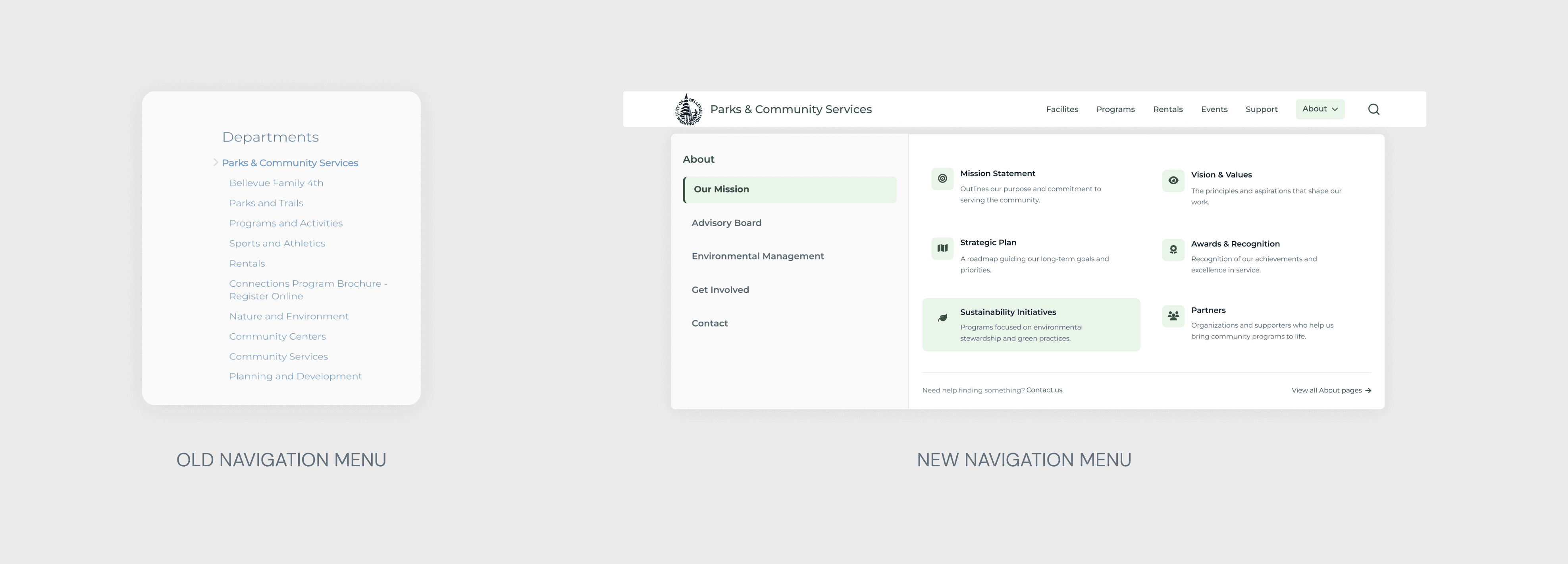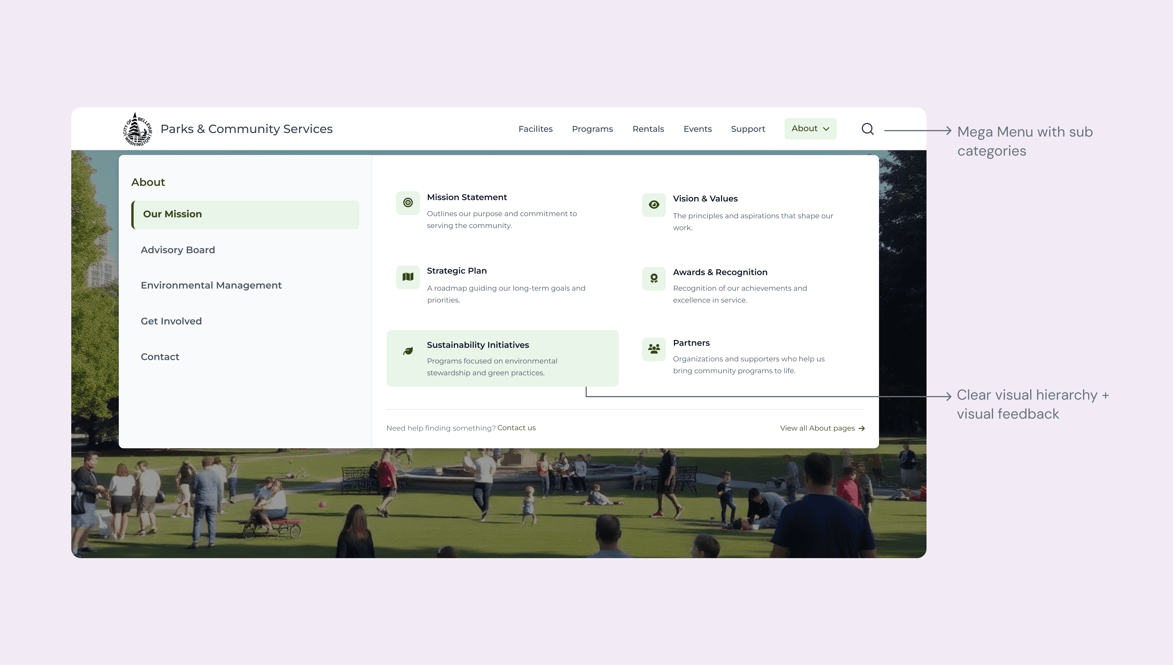 I chose a mega menu option to accommodate the broad and diverse offerings on the Parks and Community Services website—ranging from programs and facilities to permits and events.