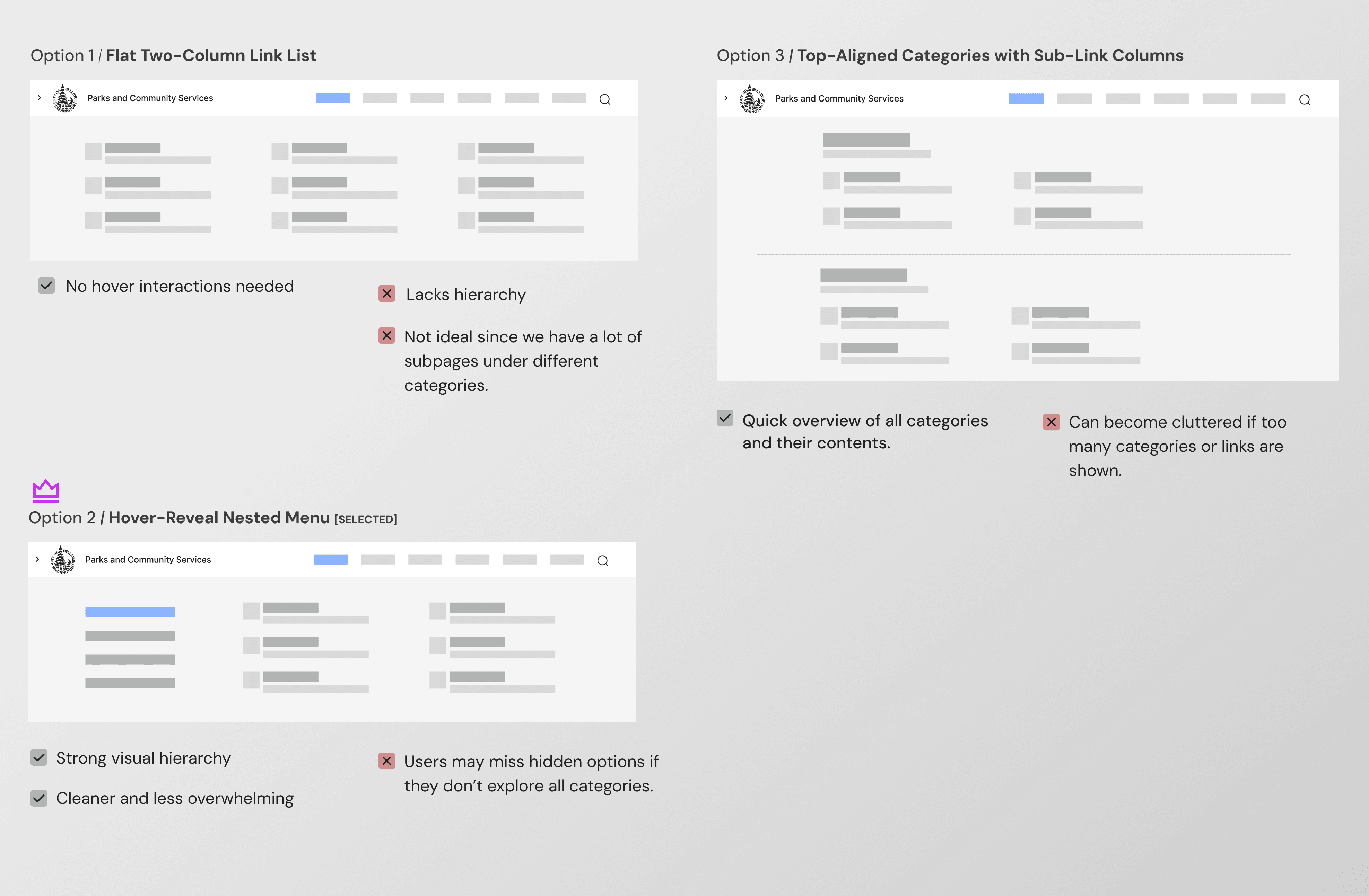 I led the transformation of the site’s information architecture (IA) to unlock and streamline core user-facing features—making it easier for residents to find, engage with, and act on the city’s park programs and services. I researched competitor sites, tested information structure, and designed a two-column menu with categories and clear links featuring icons and descriptions.