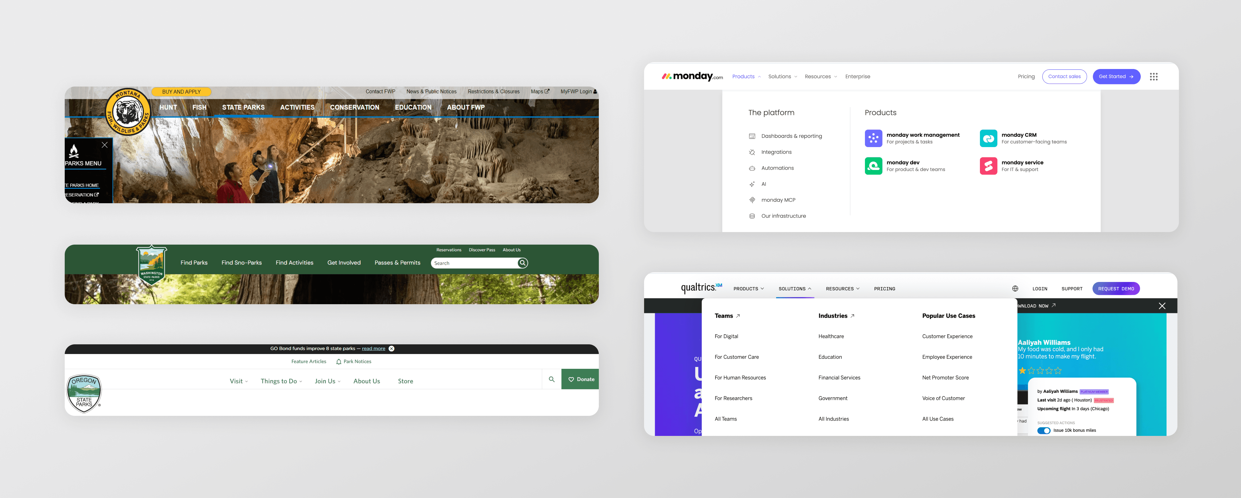 To inform the redesign, I conducted a competitor analysis of navigation bars across 5 major parks’ websites to understand common patterns and user expectations. I also performed audits of 10 top-performing navigation bars outside the industry to identify best practices.