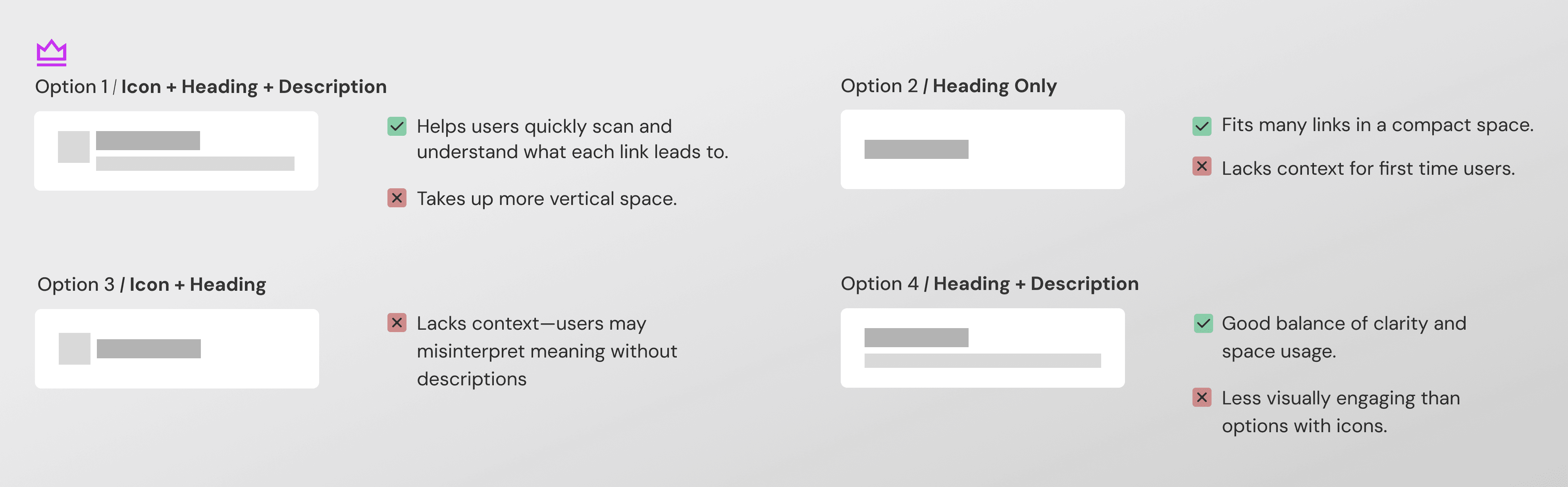 I chose Option 1 – Icon + Heading + Description, as it provides the best combination of clarity, scannability, and guidance—especially important for a diverse public audience visiting a Parks and Community Services site.