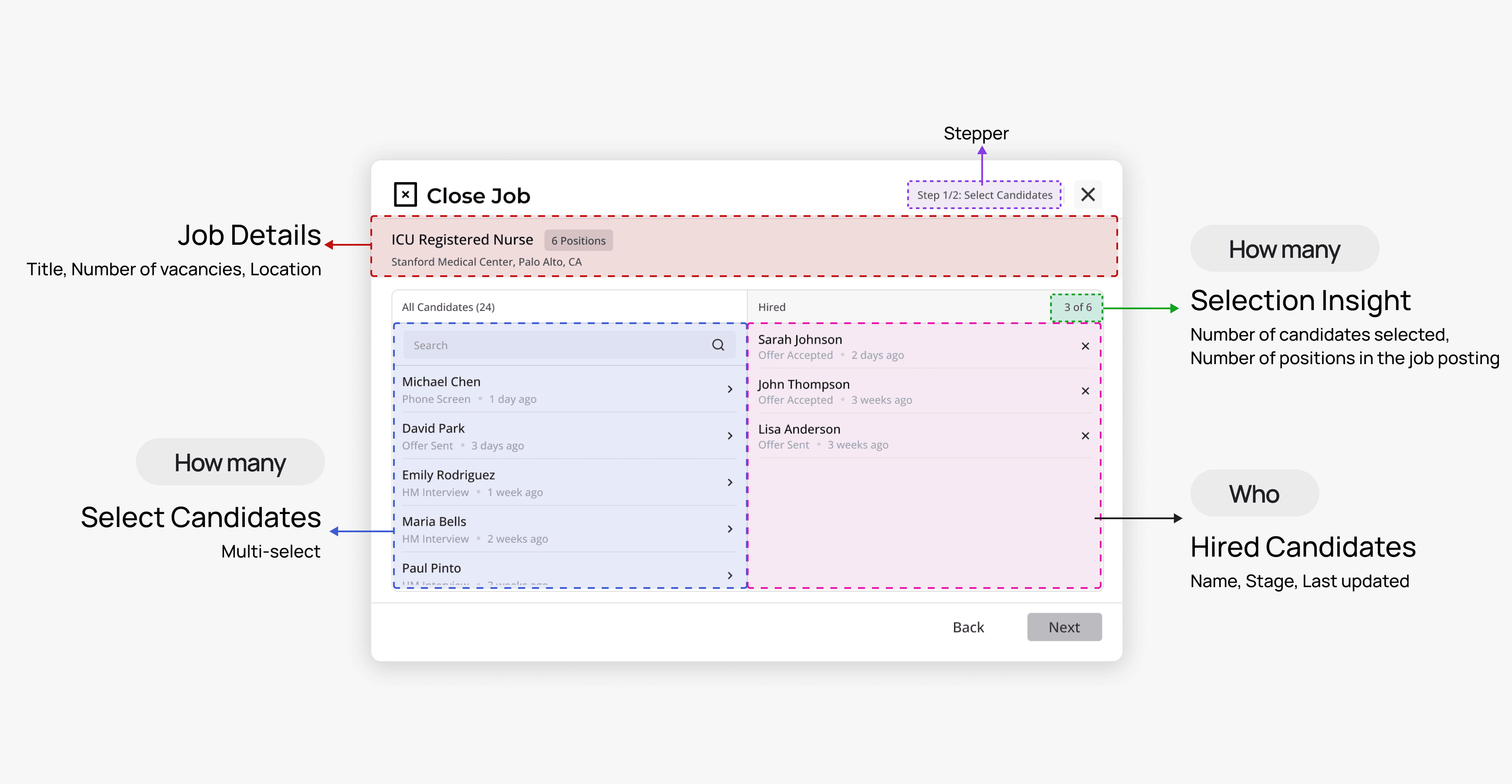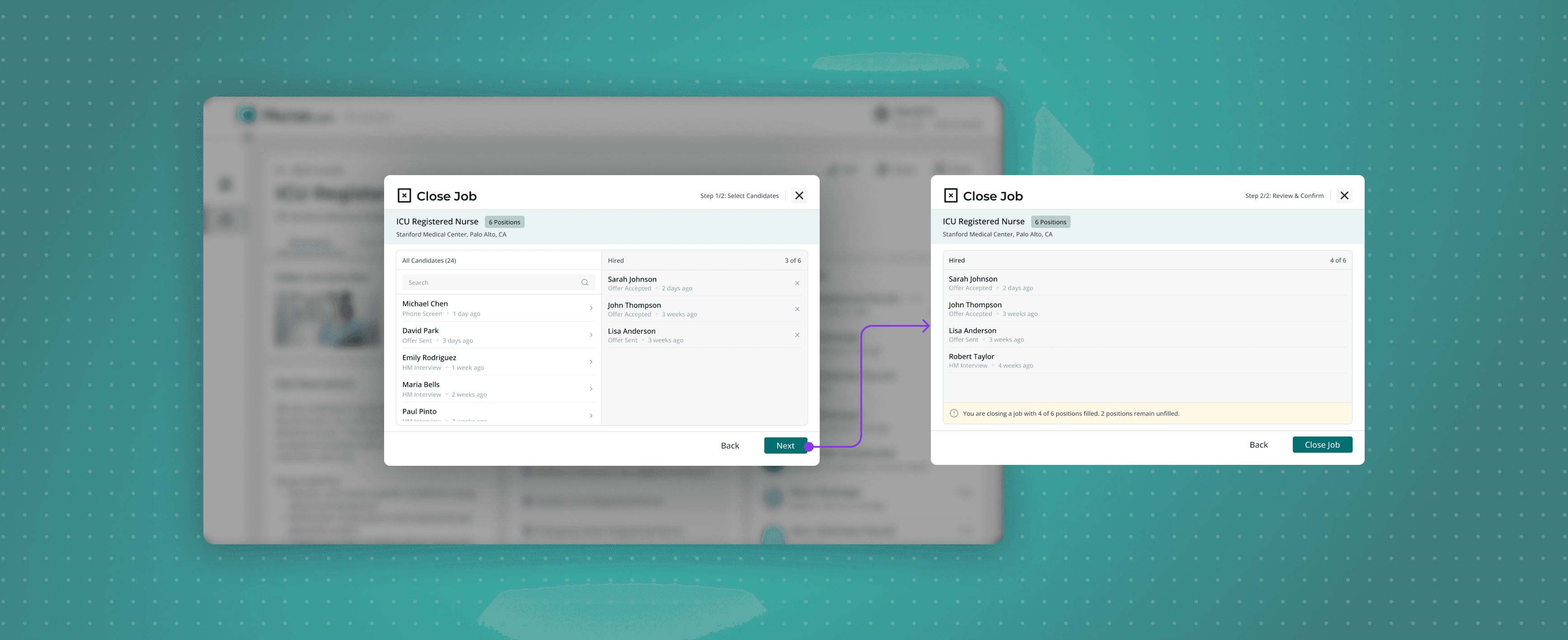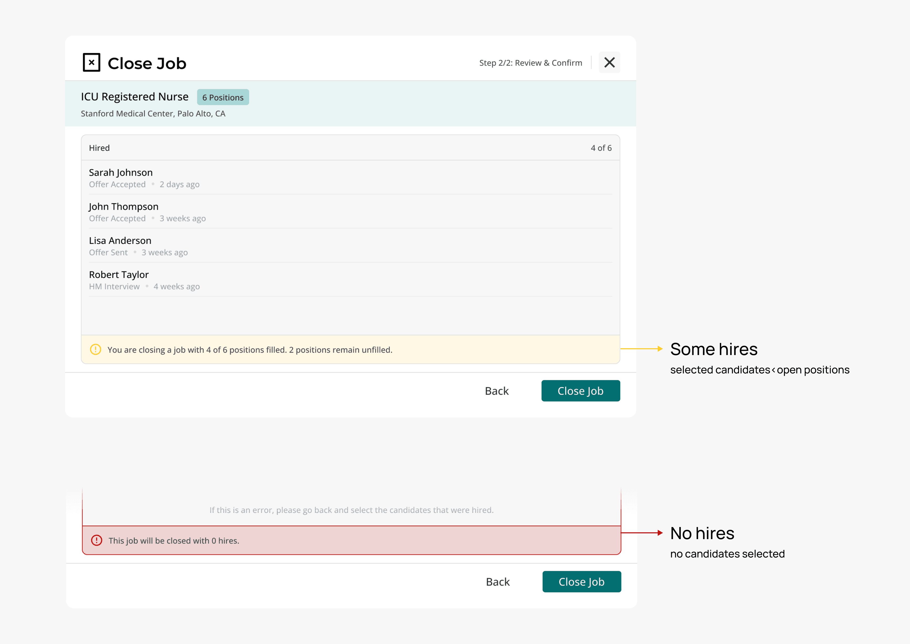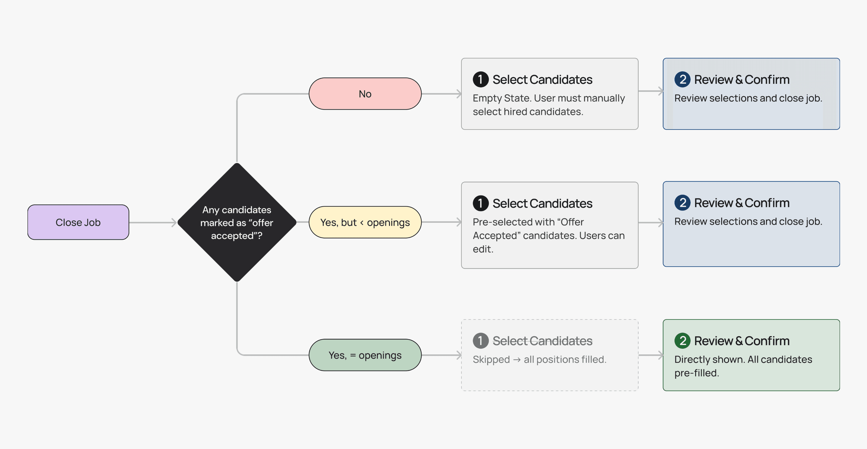 Jobs close in messy ways — all roles filled, some, or none. Instead of forcing one path, we introduced branching flows for each scenario with inline warnings that surface what's about to change before users commit.